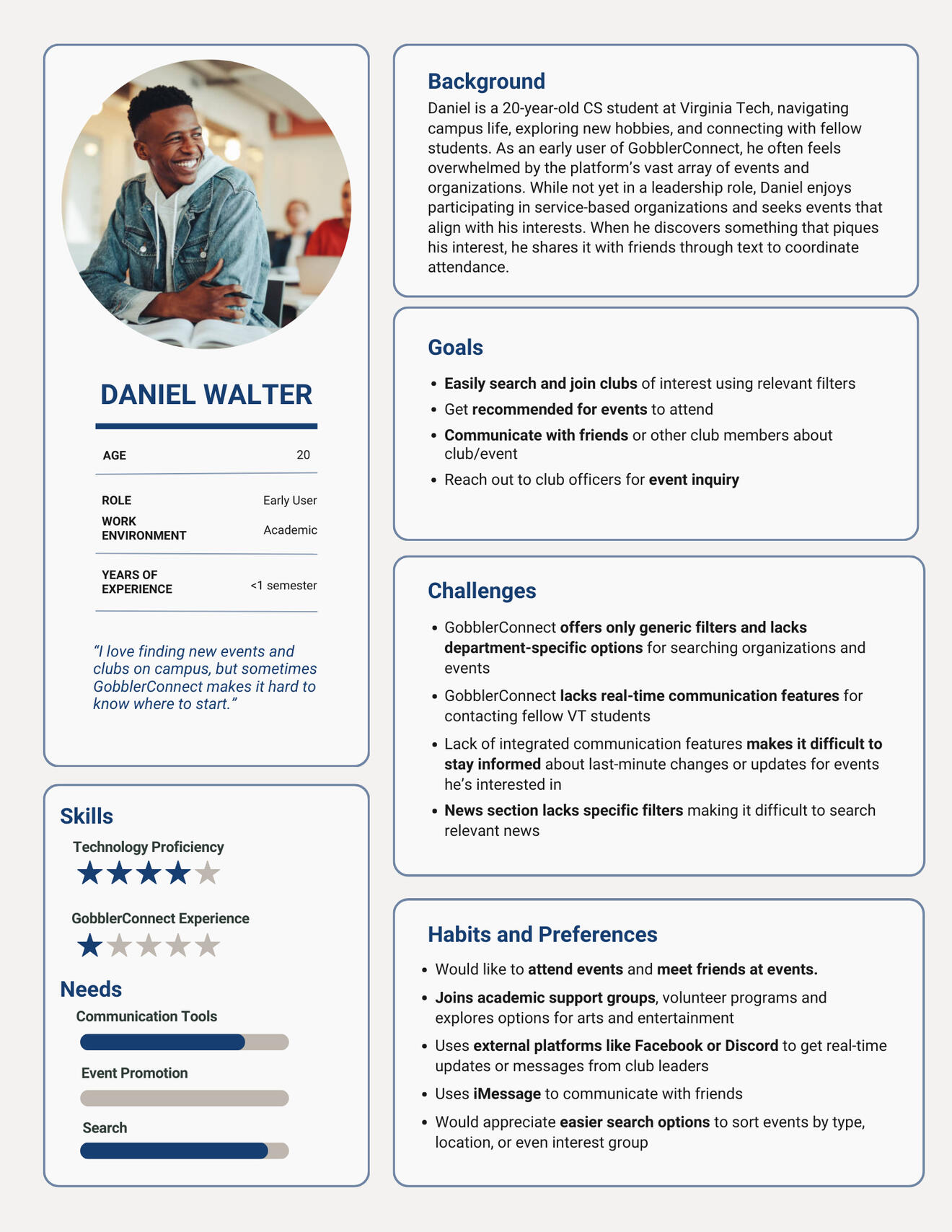 Narrowing Down ScopeOne of the most valuable lessons from this project was learning how to narrow down scope in an open-ended context. GobblerConnect presented numerous challenges, and it wasn’t immediately clear which issues were the most important. Prioritizing problems that had the greatest impact on UX taught me how to focus research efforts and deliver meaningful, actionable solutions.